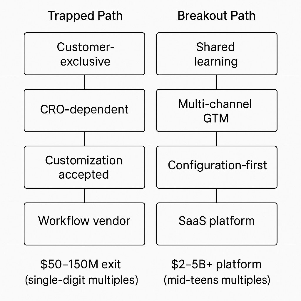 If each pharma client’s data can’t feed a global model, every deployment must be bespoke. You can’t build configuration tools that work across all trials because you don’t have cross-trial intelligence. You can’t resist customization because you have no platform value to point to.